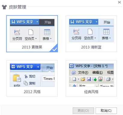WPS 2013为用户准备了四套皮肤界面,用户可以根据自己的喜好对产品进行换肤。WPS为喜欢尝鲜的用户准备了2款2013风格的皮肤,分别是素雅黑和清新蓝。同时也为习惯使用老版本的用户准备2012风格和经典风格的皮肤,无论喜欢哪类风格的用户都能使用自己喜欢的皮肤。