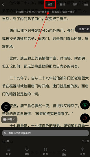 5、在阅读界面,点击中心位置,即可开启设置,选择上方的【换源】;
